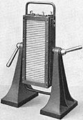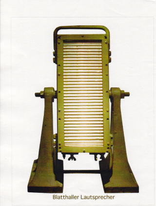 Schmaler Blatthaller Elektrodynamischer Grosflachenlautsprecher von Siemens & Halske, kleinere Variante des quadratischen Blatthallers von Riegger. http://www.medienstimmen.de/ela/lautsprecher/modelle/siemens/gr/ fischer_lichte1931_155.htm |