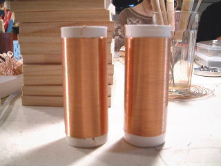 製作した鉱石ラジオの同調用コイル。トイレットペーパー、サランラップなどの紙筒にウレタン線を巻きつける。左:私、右:息子、技術の差わかりますか?ただ、見た目と性能は一致しないのが高周波の世界。ちなみに数値は、私:397μHでQは未測定、息子:342μHのQは1.08であった。 |