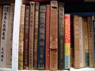 小林氏蔵書の<ほん>の一部、明治、大正、昭和と歴史的な蔵書がいっぱい少年技師著者の山北藤一郎やスピーカー作りで著名な長岡鉄男の著書も写っている。 |