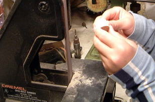 ツマミを丸棒から切り出して製作、ベルトサンダーで表面仕上げと面取り中! |