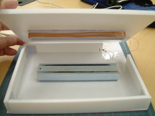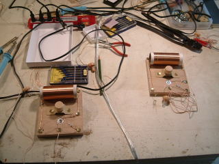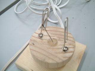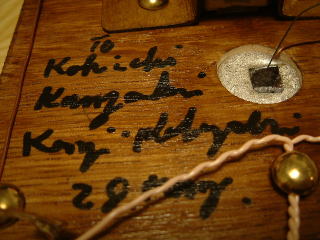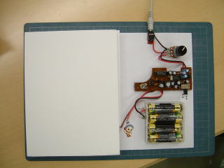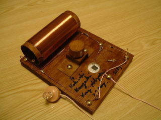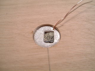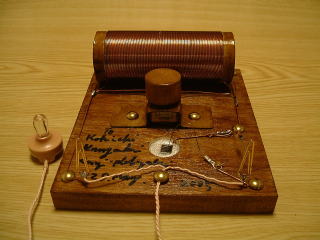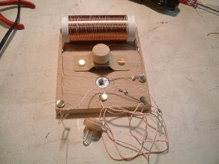 後日、ニスで塗装し、画鋲を太鼓釘に変更し、セラミックイヤホンも半田付けした。 |