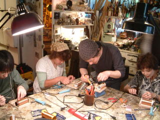小林健二氏は今回のワークショップのために鉱石ラジオキットをデサインした。このワークショップは大変参加希望者が多く、本来2回のところ3回行われ、さらに2005年の3月、5月にも追加で企画された。参加の動機は小林健二氏のアトリエでのワークショップということである。 |