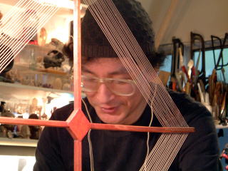 小林健二氏1957年東京生まれ。科学にとても精通した芸術家で、現代の鉱石ラジオの分野では第一人者。著書「ぼくらの鉱石ラジオ」(このHPのMY BOOKを参照)自然現象の知識はとても深くさまざまな自然現象を利用した作品を数多く制作し独特な表現方法で見るものを惹きつける。また、作品に使用する多数の工具を所有し知識も豊富。とても気さくな人柄で私が夢見る理想の活動をしている。写真は大型の鉱石ラジオについて解説中。 |