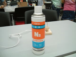 真空引きは大変なので窒素ガスで空気(酸素)を追い出す。ビーカーの注ぎ口からシューッツとね。 窒素が足りないとフィラメントは一気に燃えてしまうぞ。 一瞬のきらめきが好きな人はいいが・・・。 |