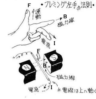 フレミングの左手の法則 「F B I だ 手を上げろ!」 と覚えましょう。 親指が F 電磁力の記号 [ F ] 人差し指が B 磁束密度の記号 [ B ] 中指が I 電流の記号 [ I ] 左図は、誠文堂新光社 絵で見るエレクトロニクスのABC 泉弘志 より引用 記号を付け加えました。 |